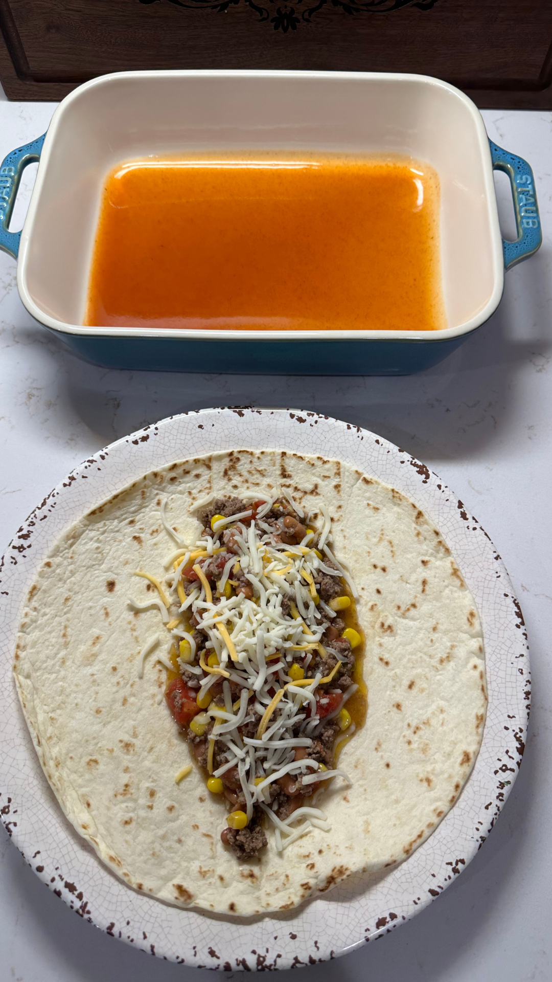 - Use the remaining enchilada sauce and coat dish